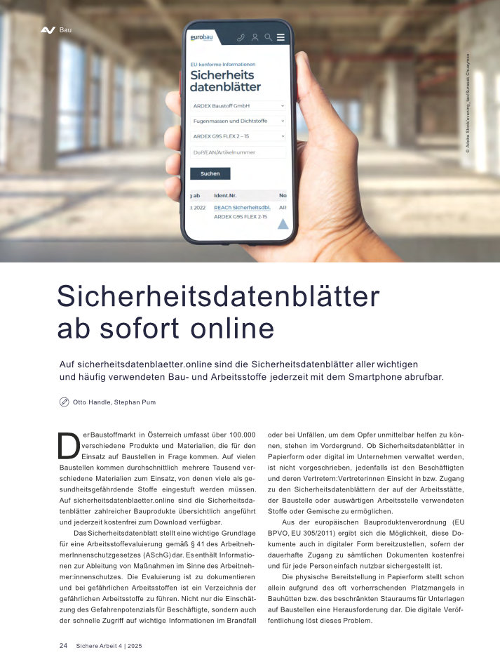 Sicherheit ohne Papierstapel: Das Sicherheitsdatenblatt stellt eine wichtige Grundlage für eine Arbeitsstoffevaluierung gemäß § 41 des ArbeitnehmerInnenschutzgesetzes (ASchG) dar. Es enthält Informationen zur Ableitung von Maßnahmen im Sinne des Arbeitnehmer:innenschutzes. Die Evaluierung ist zu dokumentieren und bei gefährlichen Arbeitsstoffen ist ein Verzeichnis der gefährlichen Arbeitsstoffe zu führen. Nicht nur die Einschätzung des Gefahrenpotenzials für Beschäftigte, sondern auch der schnelle Zugriff auf wichtige Informationen im Brandfall oder bei Unfällen, um dem Opfer unmittelbar helfen zu können, stehen im Vordergrund. Das internationale Fachmagazin "Sichere Arbeit" http://lnkd.in/dd2_faVM informiert über die anwendungsfreundliche Nutzung über die #Baumappe www.baumappe.at der Bundesinnung Bau und die gemeinsam mit AUVA - Allgemeine Unfallversicherungsanstalt, Bundesinnung und basierend auf den Sicherheitsdatenblättern der österreichischen Baustoffwirtschaft kostenlos bereitgestellte lnkd.in/d2kq9fb9