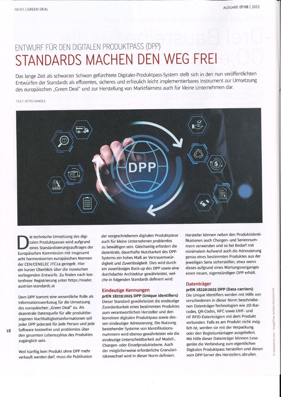 Die Umsetzung des Digitalen Produktpasses schreitet voran. Weil künftig kein Produkt ohne DPP mehr verkauft werden darf, muss die Publikation der vorgeschriebenen digitalen Produktpässe auch für kleine Unternehmen problemlos zu bewältigen sein. Gleichzeitig erfordert die dezentrale, dauerhafte Nutzbarkeit des DPP Systems ein hohes Maß an Vertrauenswürdigkeit und Zuverlässigkeit. Die nun vorliegenden Entwürfe der technischen Umsetzungsstandards durfte ich in der aktuellen Ausgabe der a3BAU detailliert darstellen. Vielen Dank an Sabine Müller-Hofstetter für die Möglichkeit der Publikation. Danke auch an meine Kolleginnen und Kollegen im CEN and CENELEC JTC 24 für die Unterstützung bei der Erarbeitung dieser wichtigen Standards!