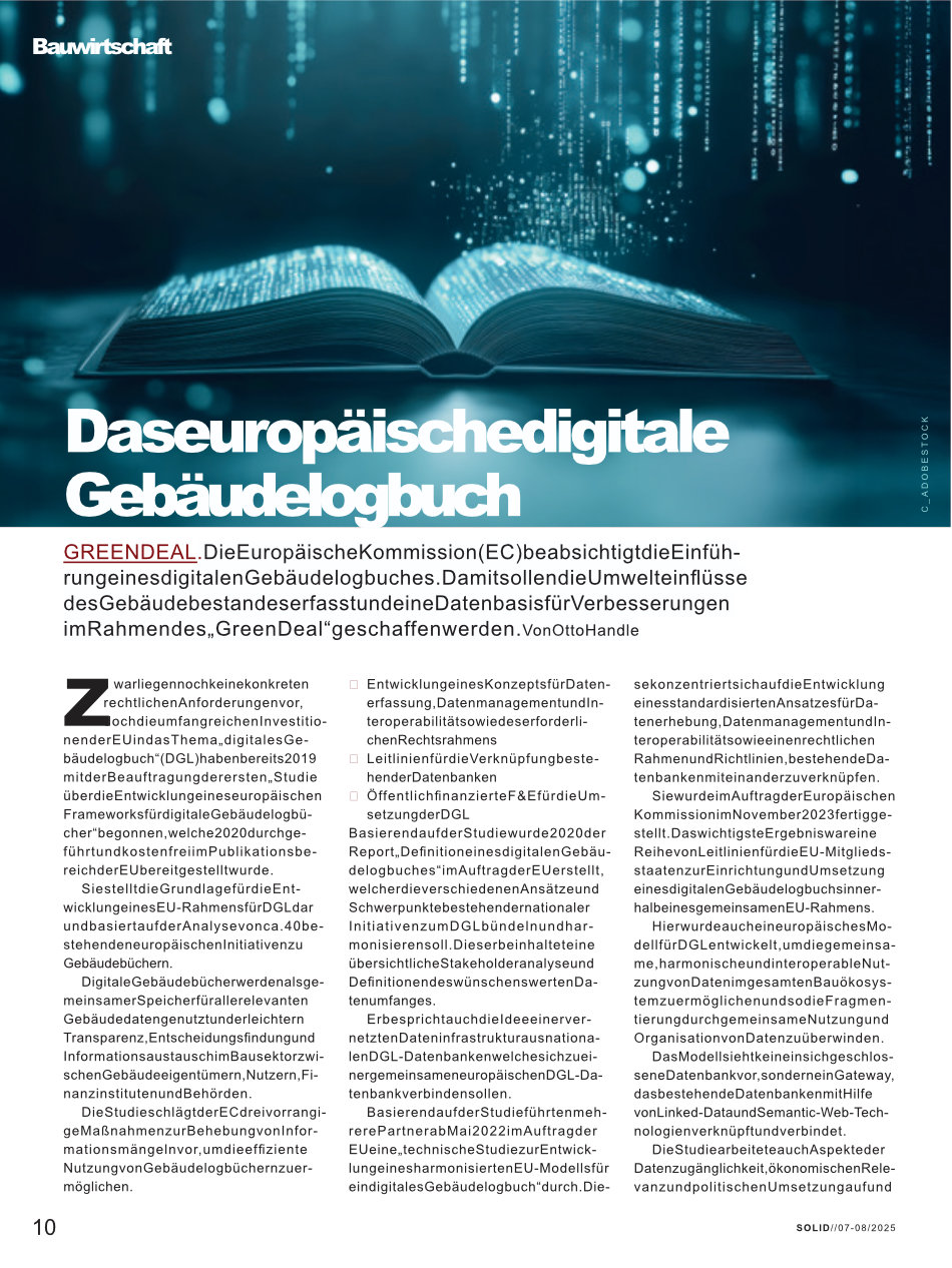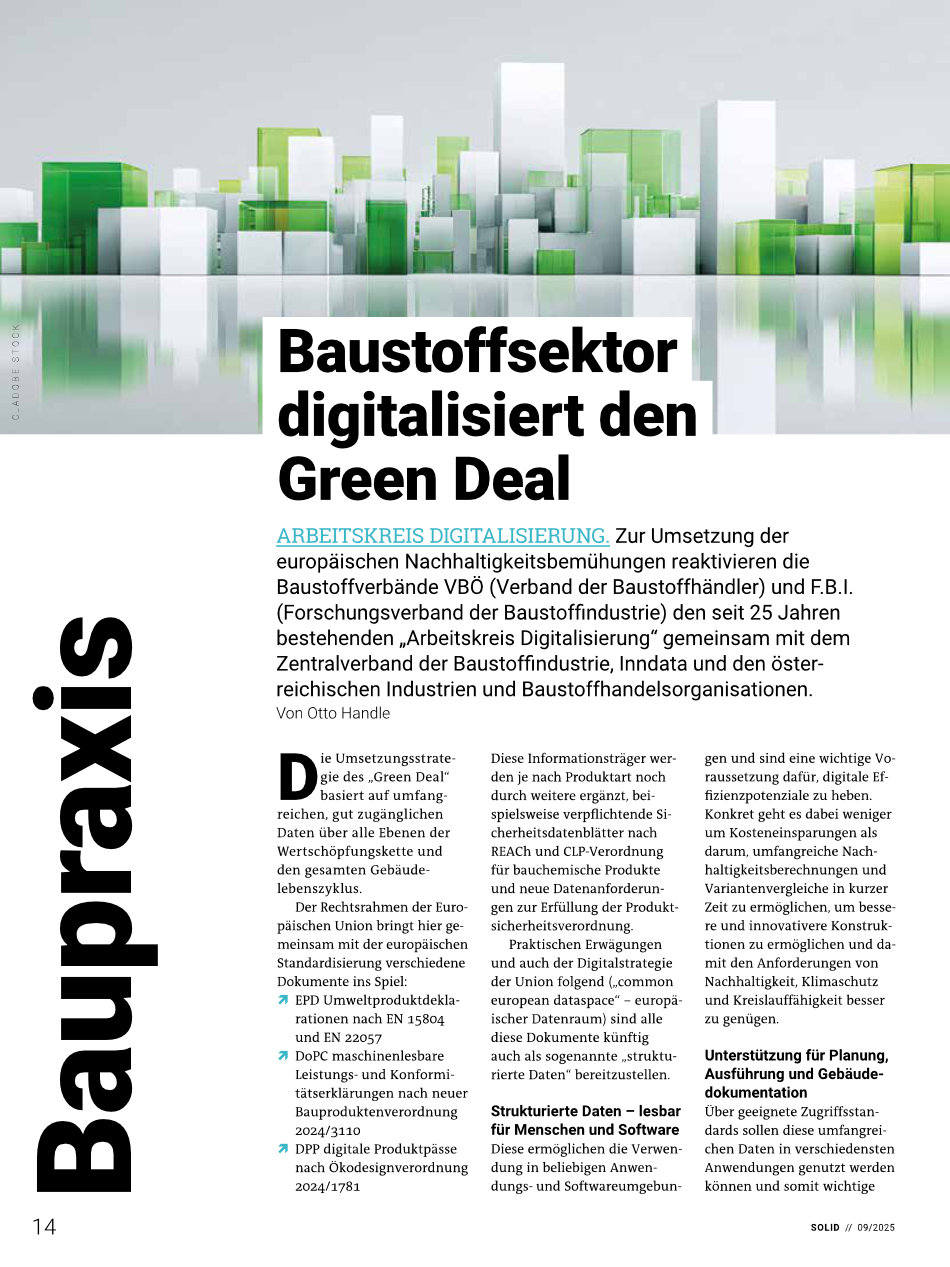 Die Umsetzungsstrategie des „Green Deal“ basiert auf umfangreichen, gut zugänglichen Daten über alle Ebenen der Wertschöpfungskette und den gesamten Gebäude-Lebenszyklus. Zur Umsetzung der europäischen Nachhaltigkeitsbemühungen reaktivieren die Baustoffverbände VBÖ (Verband der Baustoffhändler) und FBI - Forschungsverband der österreichischen Baustoffindustrie den seit 25 Jahren bestehenden „Arbeitskreis Digitalisierung“ gemeinsam mit dem Zentralverband der Baustoffindustrie, Inndata Datentechnik GmbH und den österreichischen Industrien und Baustoffhandelsorganisationen. Vielen Dank an Katharina Sigl (FBI) und Susanne Aigner-Haas (VBÖ) sowie Bettina Kreuter für die Möglichkeit zur Publikation in der aktuellen SOLID - Fachmagazin