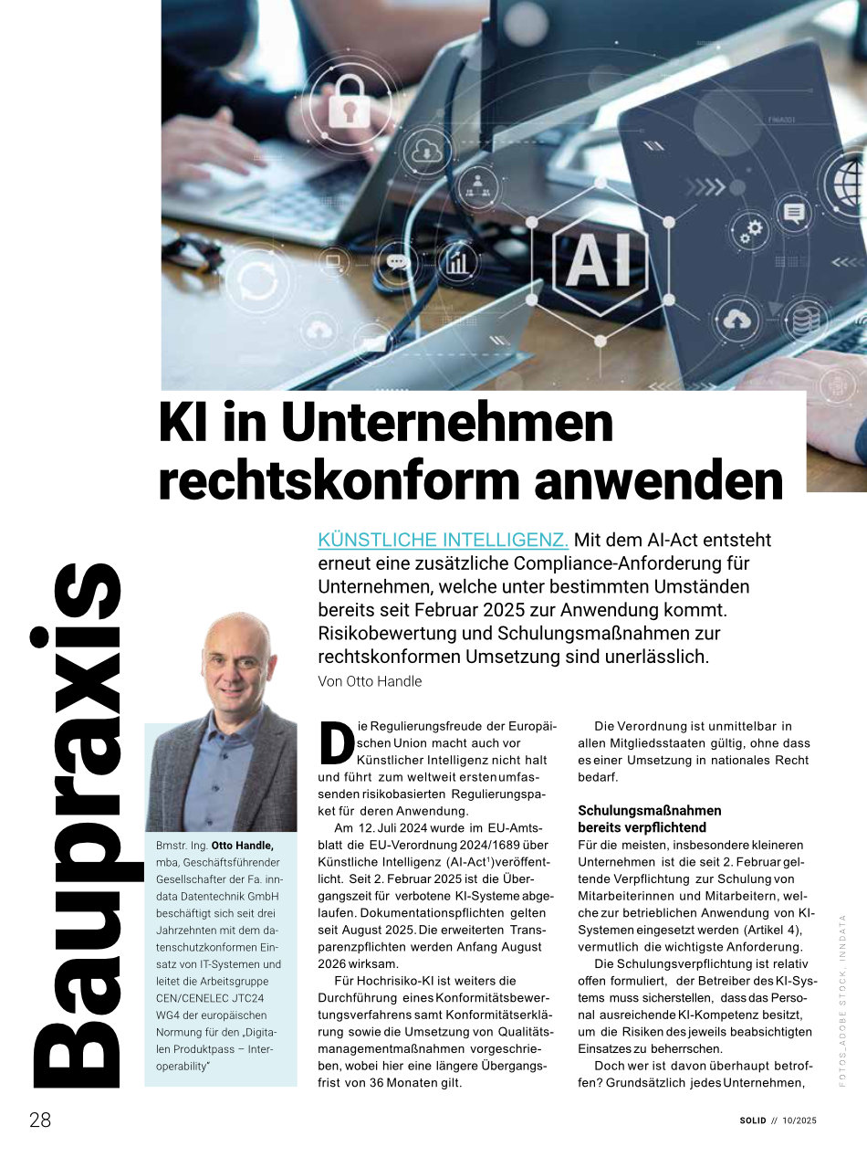Am 12. Juli 2024 wurde im EU-Amtsblatt die EU-Verordnung 2024/1689 über Künstliche Intelligenz (AI-Act) veröffentlicht. Mit einem risikobasierten Ansatz reguliert die EU die sichere und datenschutzkonforme Anwendung von KI. Welche Vorkehrungen Sie heute schon treffen sollten, und wie Sie mit lokal betriebenen Anwendungen Datenschutzbedenken begegnen können durfte ich in nachfolgendem Artikel in der Fachzeitschrift SOLID - Fachmagazin publizieren. Vielen Dank an Bettina Kreuter und Thomas Pöll!