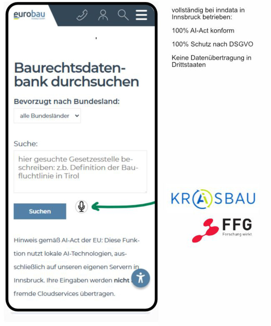 Fragen Sie in natürlicher Sprache nach dem österreichischen Rechtsrahmen im Bauwesen. Also tatsächlich mündlich! Das komplett in Innsbruck gehostete, im Rahmen des FFG Leitprojektes KRAISBAU entwickelte AI-System steht nun kostenfrei im Testbetrieb zur Verfügung. Tatsächlich benötigen wir die AI Technologie in KRAISBAU für andere, herausfordernde Themen, doch fanden wir es nützlich Ihnen hier unsere bestehende, umfangreiche Baurechtsdatenbank damit bequem und sicher zugänglich zu machen. Probieren Sie es einfach aus und helfen Sie uns, Erfahrungswerte zu sammeln. Ohne Anmeldung, ohne Kosten unter lnkd.in/d3sn-79i einfach das Mikrofon-Symbol antippen und sprechen. Oder tippen.